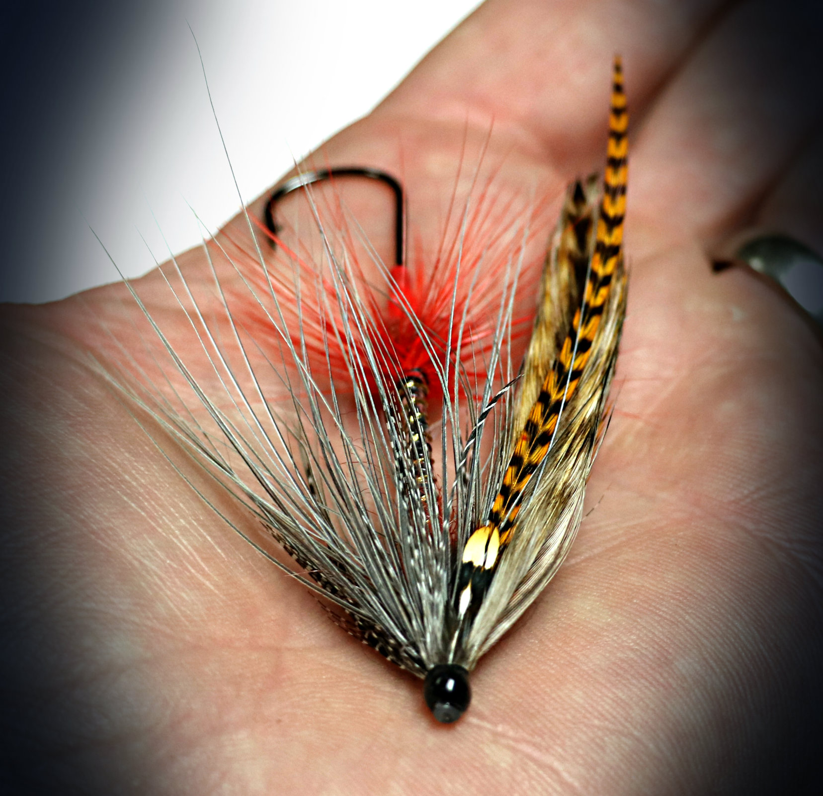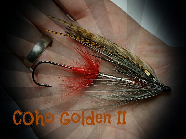 | We first fell in love with the Coho Golden years ago after first seeing a picture of Haig-Browns original pattern. We tied up a few and had pretty good luck with them in the Queen Charlotte Islands in Northern BC. A nice surprise was how well they worked for Cutthroats and Dollies when we tied them down on smaller hooks. While “freestyling” recently we took what we liked about the fly and tried it again with a few different materials. One might say that the new version is pretty loosely based on the original….. |